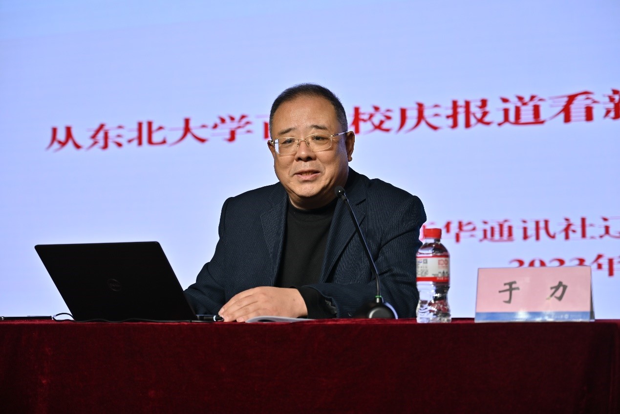 于力从东北大学百年校庆宣传切入,围绕校庆宣传报道、新闻报道需要注意的问题、新闻报道写作技巧等方面展开辅导。于力以《新华每日电讯》发表文章《“爱国”两个字,这所大学书写了一百年——回望东北大学与祖国命运与共的岁月》为例,从报道主题的提炼过程、标题和导语的敲定过程、结构布局和细节选择等方面作详细的讲解,并阐明了为何把“爱国”作为百年校庆报道的主色调。