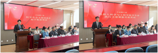 大会在雄壮的国歌声中拉开帷幕。校学生会主席团成员赵宇航代表校学生会致贺词,机器人科学与工程学院学生会执行主席翟航齐代表兄弟学院学生会致贺词。
