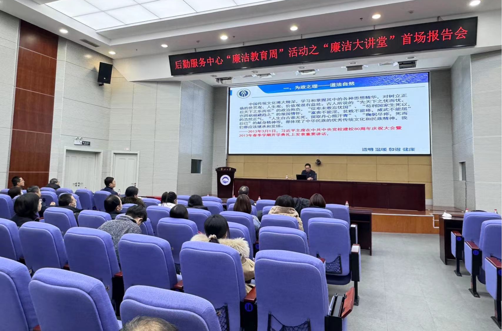 12 月 13 日上午,后勤服务中心“廉洁大讲堂”首场报告会暨廉洁警示教育大会在主楼822室举行,后勤服务中心领导班子成员,科级管理干部,班组长、各支部纪检委员共80余人参加会议。报告会由后勤服务中心副主任何春茂主持。