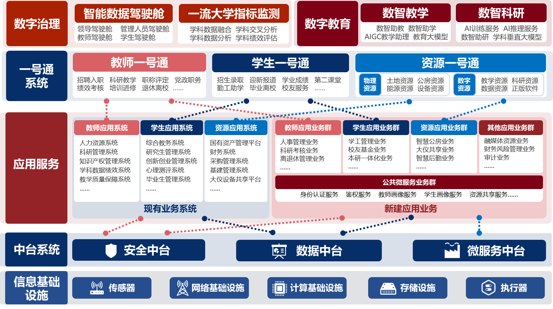 在技术体系建设方面,信网办将以智能信息基础设施建设为保障,着力打造微服务中台、数据中台和安全中台;构建基于统一中台的教师一号通、学生一号通和资源一号通应用业务系统;通过统一门户平台和智能数据驾驶舱,为全校师生提供 “业务办理、事务处理、数据汇聚、智能生成”一站式服务,实现学校公用房、大型仪器设备等物理资源和数字资源的便捷共享共治及使用绩效评价,全面赋能数字治理和数字教育。