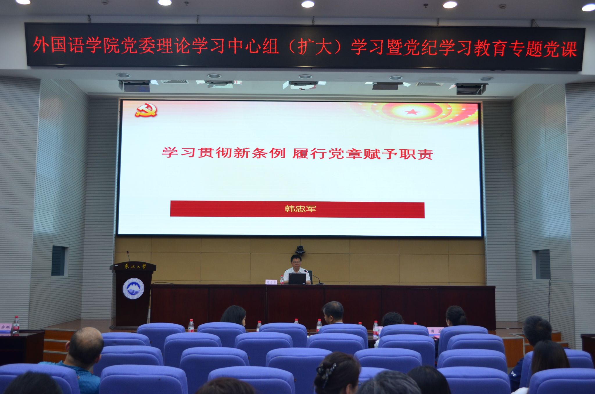 5月22日,外国语学院党委理论学习中心组(扩大)学习会议暨党纪学习教育专题党课在主楼822室举行,学院全体教职工党员、学生党员代表参加学习。学院党委书记张满胜主持会议。