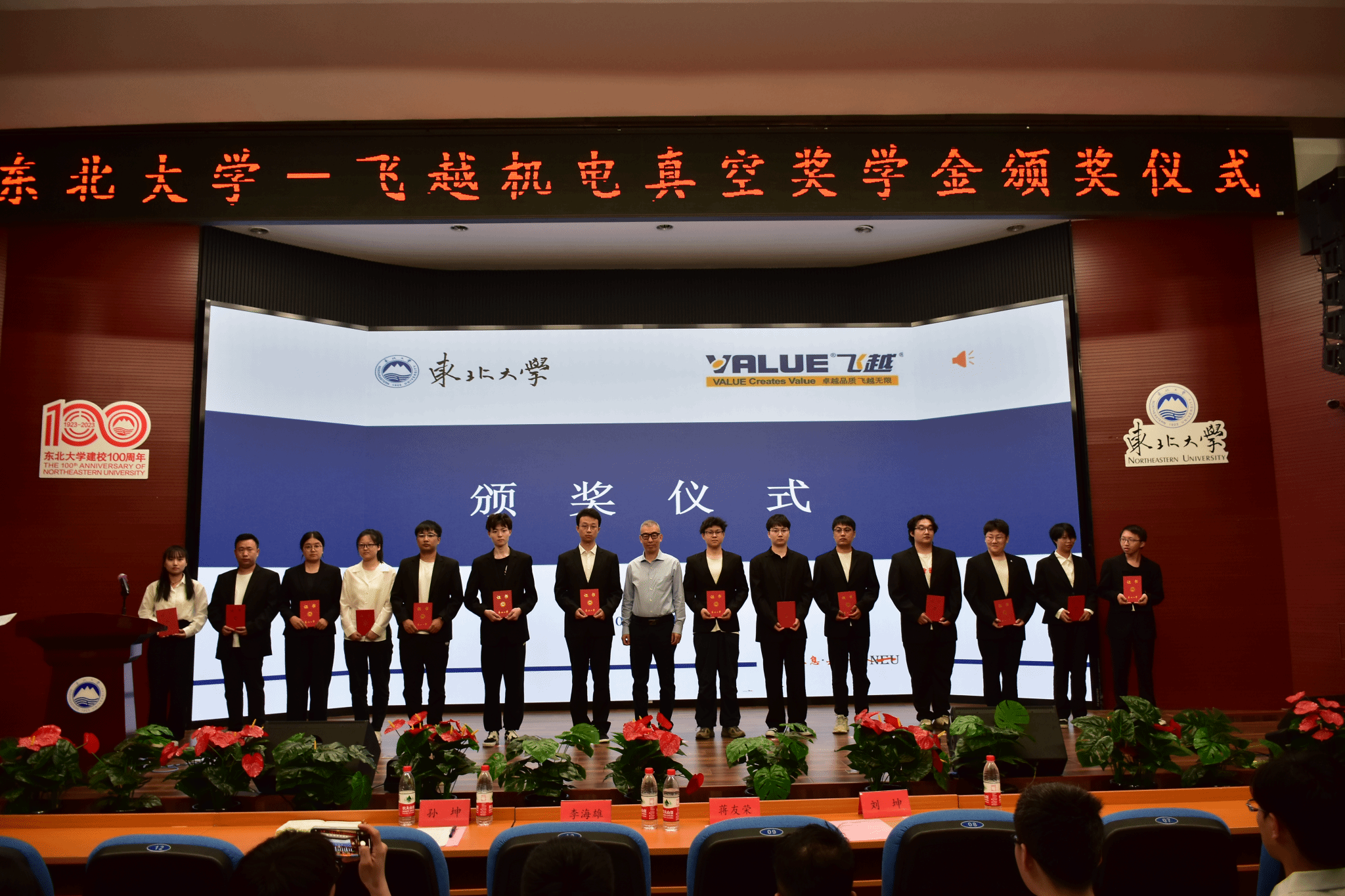 学院党委副书记刘坤教授宣读了2022-2023年度东北大学飞越机电真空奖学金获奖学生名单。2022级本科生姜鹏等8名学生、2023级硕士研究生倪春利等30名学生获得奖学金。