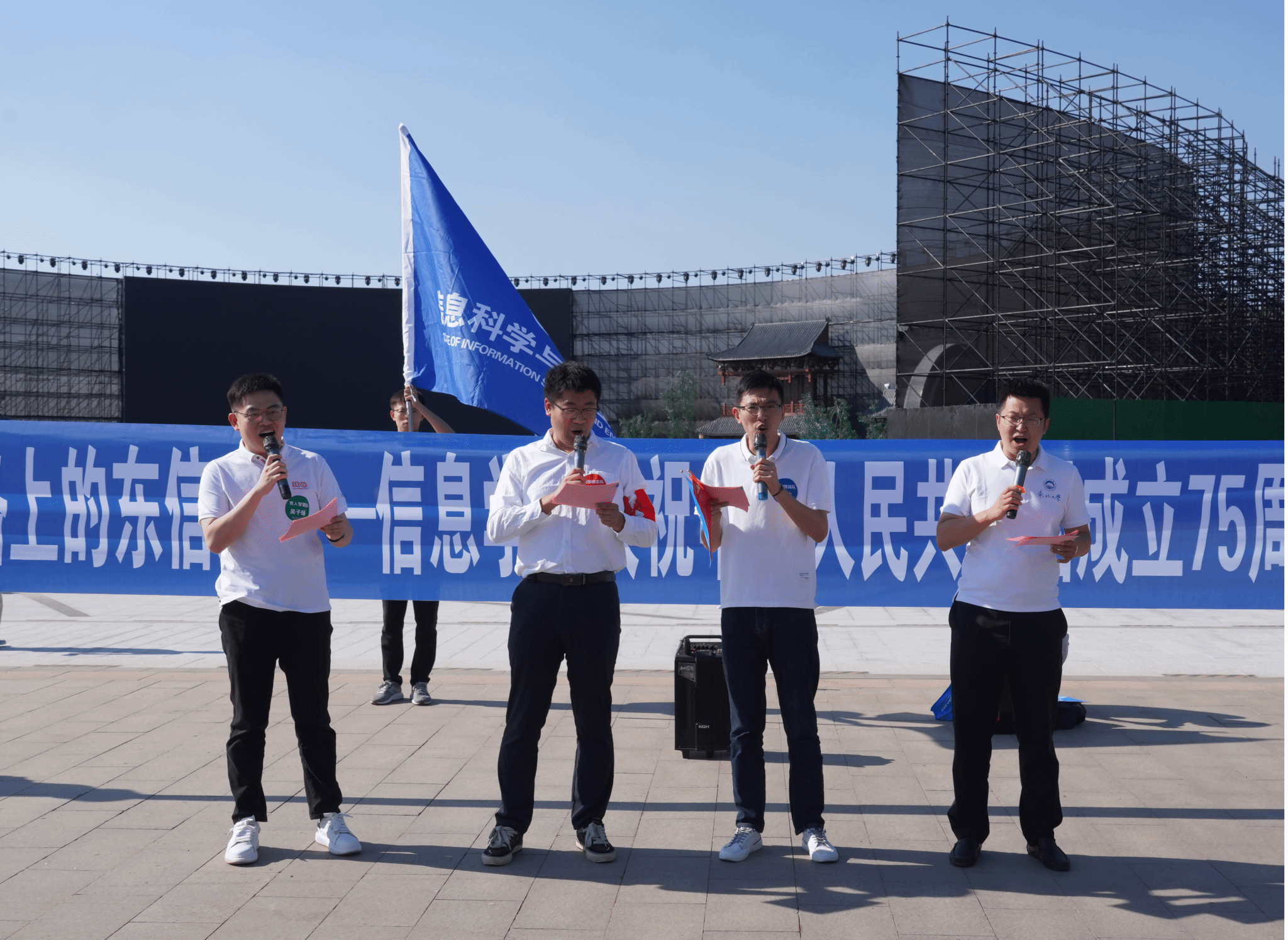 活动开幕式在丁香湖主广场举行。学院党委主要负责人表示,信息学院全体教职工始终与祖国的发展同向同行,希望广大教师在学校新百年新征程上再创佳绩,健康生活、快乐工作,同心协力、争创一流,携手共创东信辉煌。广大教师共同唱响《红旗飘飘》,用歌声祝福中华人民共和国成立75周年。