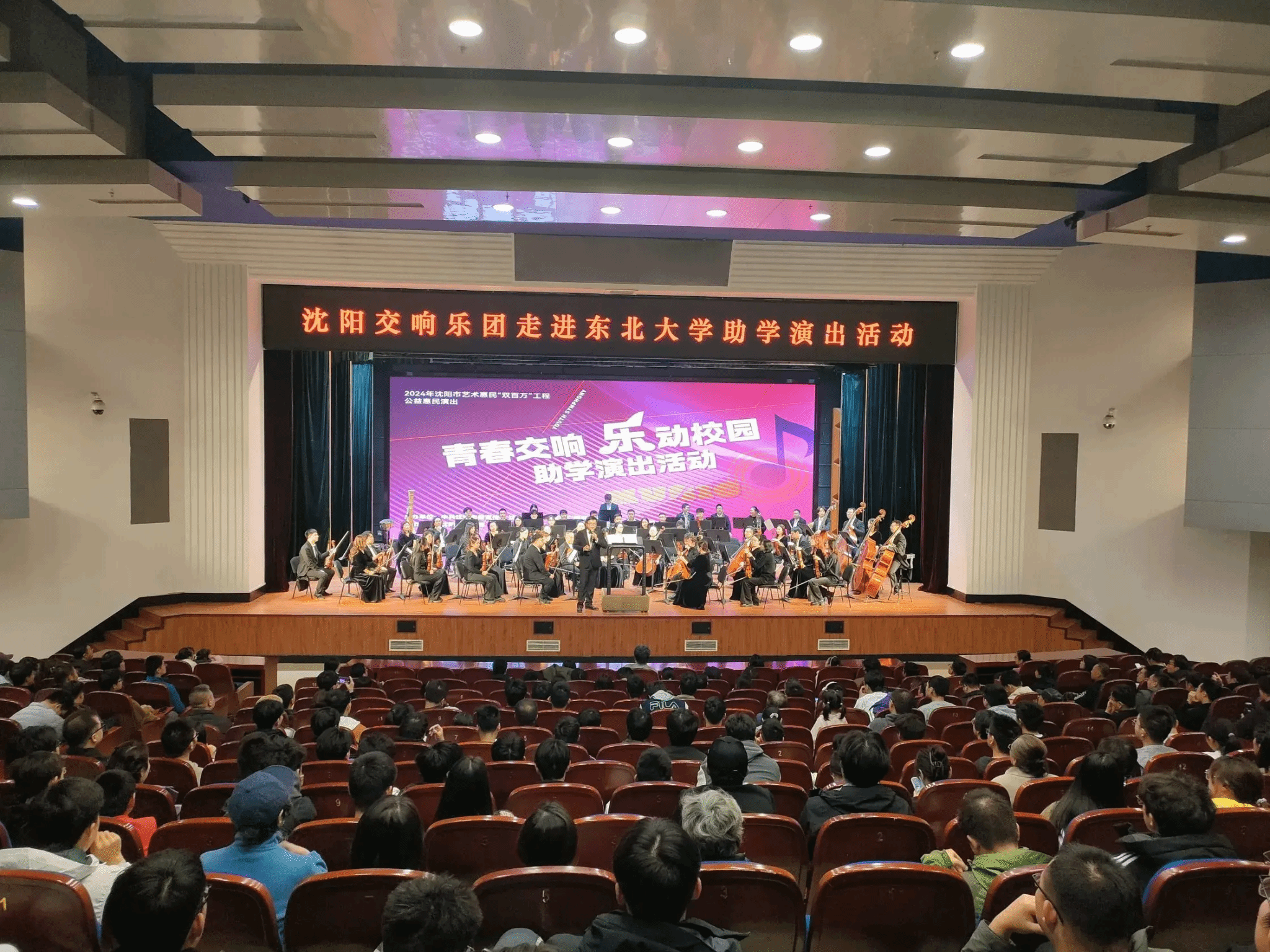 11月1日晚,由沈阳市委宣传部、沈阳市文化旅游和广播电视局主办,沈阳交响乐团承办,东北大学艺术学院知行交响乐团协办的“青春交响 乐动校园”演出活动在汉卿会堂举行,东北大学师生及部分沈城乐迷共计500余人现场观看演出。