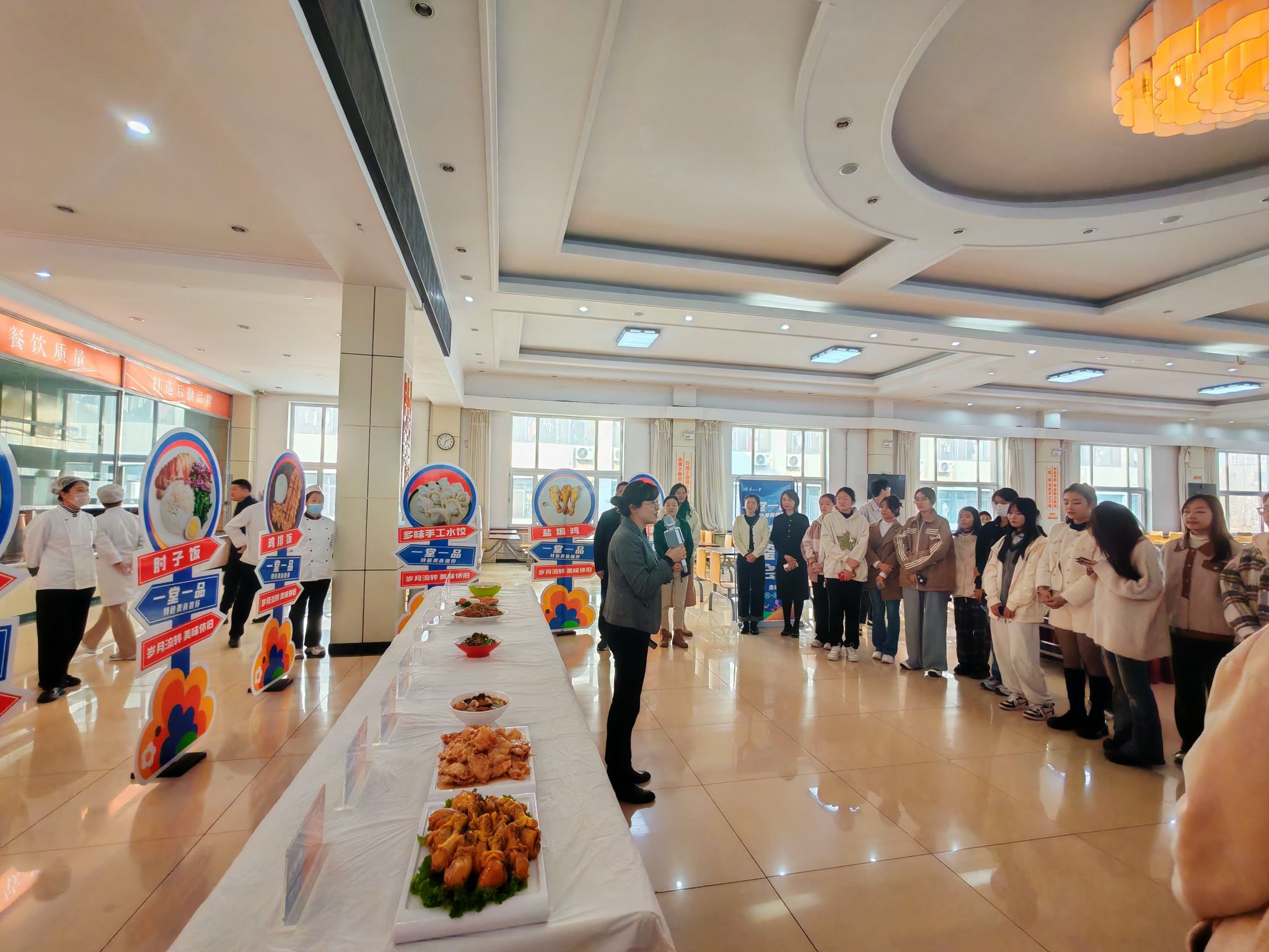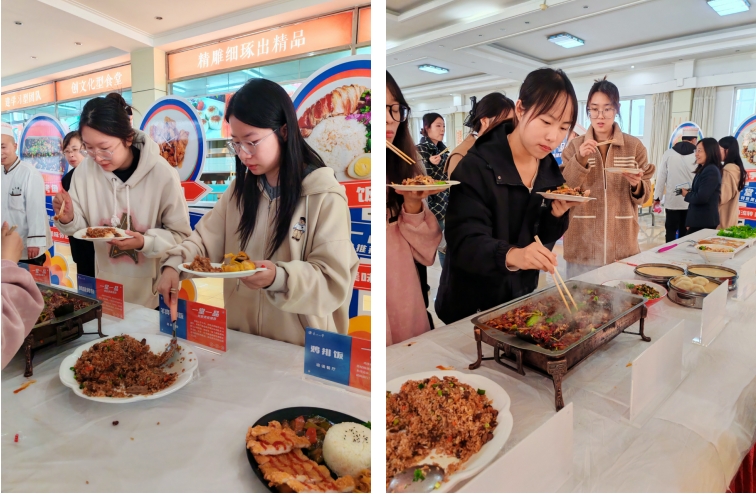 美食品鉴会现场,后勤服务中心对师生们的到来表示热烈欢迎,并诚挚感谢广大师生们长久以来对食堂工作的大力支持。师生们的膳食营养与健康是学校食堂发展运营的核心与关键。近年来,学校食堂在膳食结构的调整与优化上持续加大投入,采取推广小碗菜、设置少油少盐低脂窗口、增加自选窗口等措施,让师生们吃得健康、吃得营养,为广大同学的成长筑牢坚实根基。