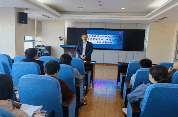 11月21日,外国语学院在主楼1008室举办科级以下干部学习贯彻党的二十届三中全会精神教育培训开班仪式暨第一次全体学习。学院机关全体人员参加培训。
