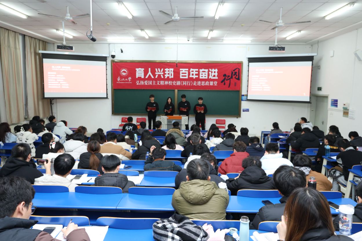 《同行》讲述了东北大学与国家发展和民族复兴同向同行的奋进故事,展现了一代代东大人实干、报国、创新、卓越的奋斗群像。从“舞台”走进“课堂”,《同行》将理论张力与艺术魅力有机融入思政课教学,提高了思政课的针对性和吸引力,创新了思政教育模式。课堂上,微视频《同行》展示了校史剧自创排以来的创作历程,主创人员从创作背景、心路历程、成长感悟等三个方面进行了交流分享。随后,主创人员共同朗诵《同心筑梦,凯歌同行》。