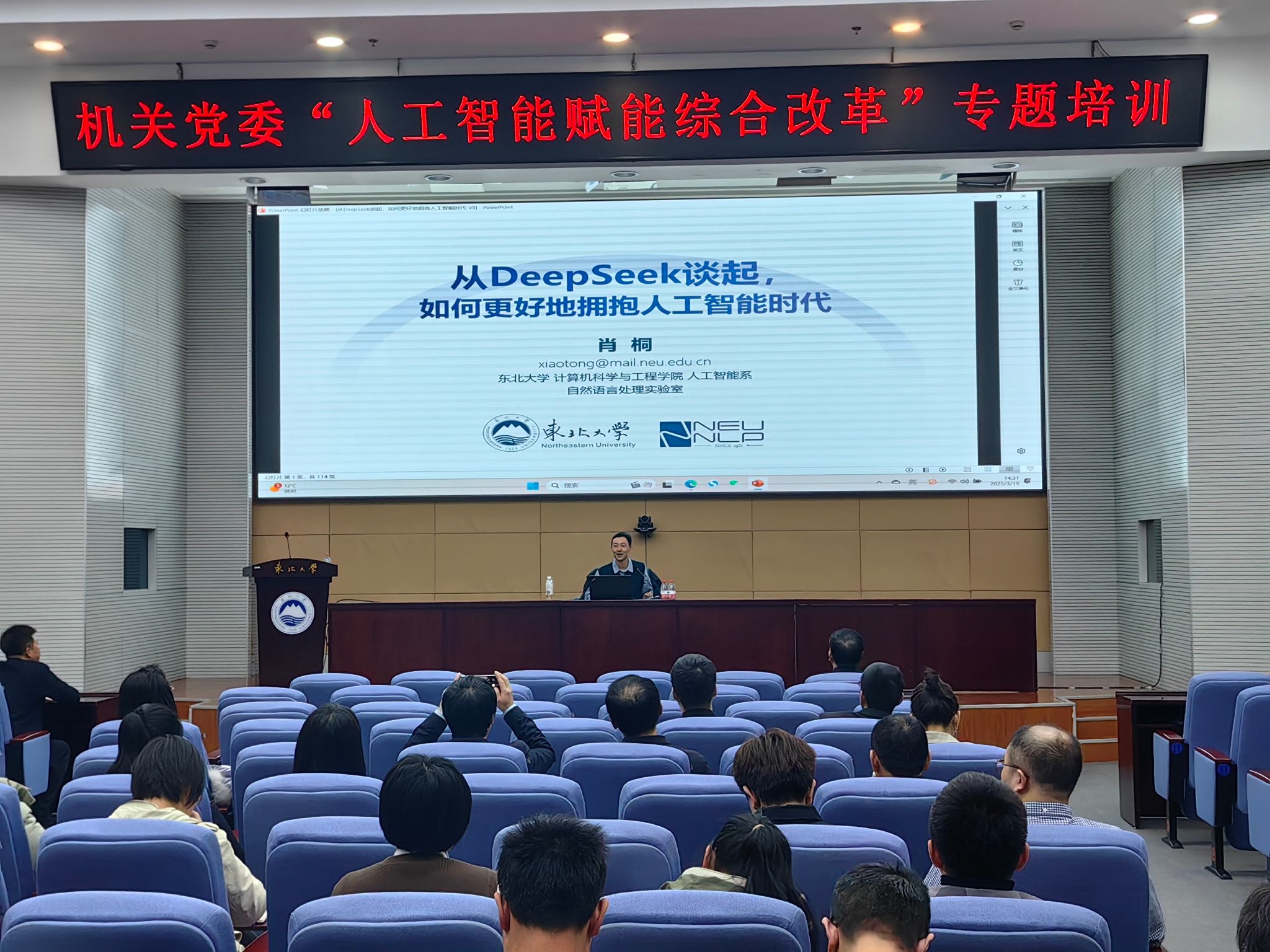 3月19日下午,机关党委、机关分党校在南湖校区主楼822会议室举办“人工智能赋能综合改革”专题培训。计算机学院教授肖桐应邀作“从DeepSeek谈起,如何更好地拥抱人工智能时代”报告。机关党委副书记、校工会副主席孟庆旺主持会议。机关各部门干部和职工代表近100人参会。