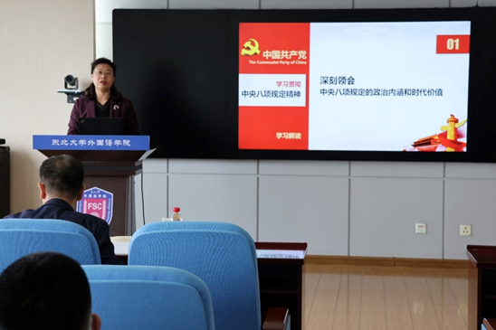 4月23日下午,外国语学院在主楼1008室举办深入贯彻中央八项规定精神学习教育专题辅导报告会。此次报告会邀请了东北大学深入贯彻中央八项规定精神学习教育宣讲团成员、马克思主义学院教授、学校党委统战部常务副部长王立慧主讲,学院领导班子成员、党委委员、师生党支部书记及支委、机关全体同志参加会议,学院党委书记张满胜主持会议。