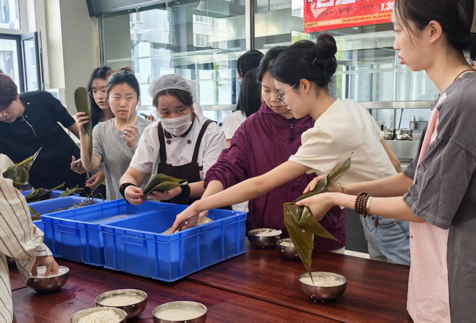 活动开始,22级本科生杨徵羽同学介绍了端午节的由来与习俗,拉开了文化序幕。同学们在食堂师傅指导下,沉浸式体验了选叶、泡米、包裹、到捆扎、蒸煮的全过程,并品尝了粽子,感受劳动成果的喜悦。