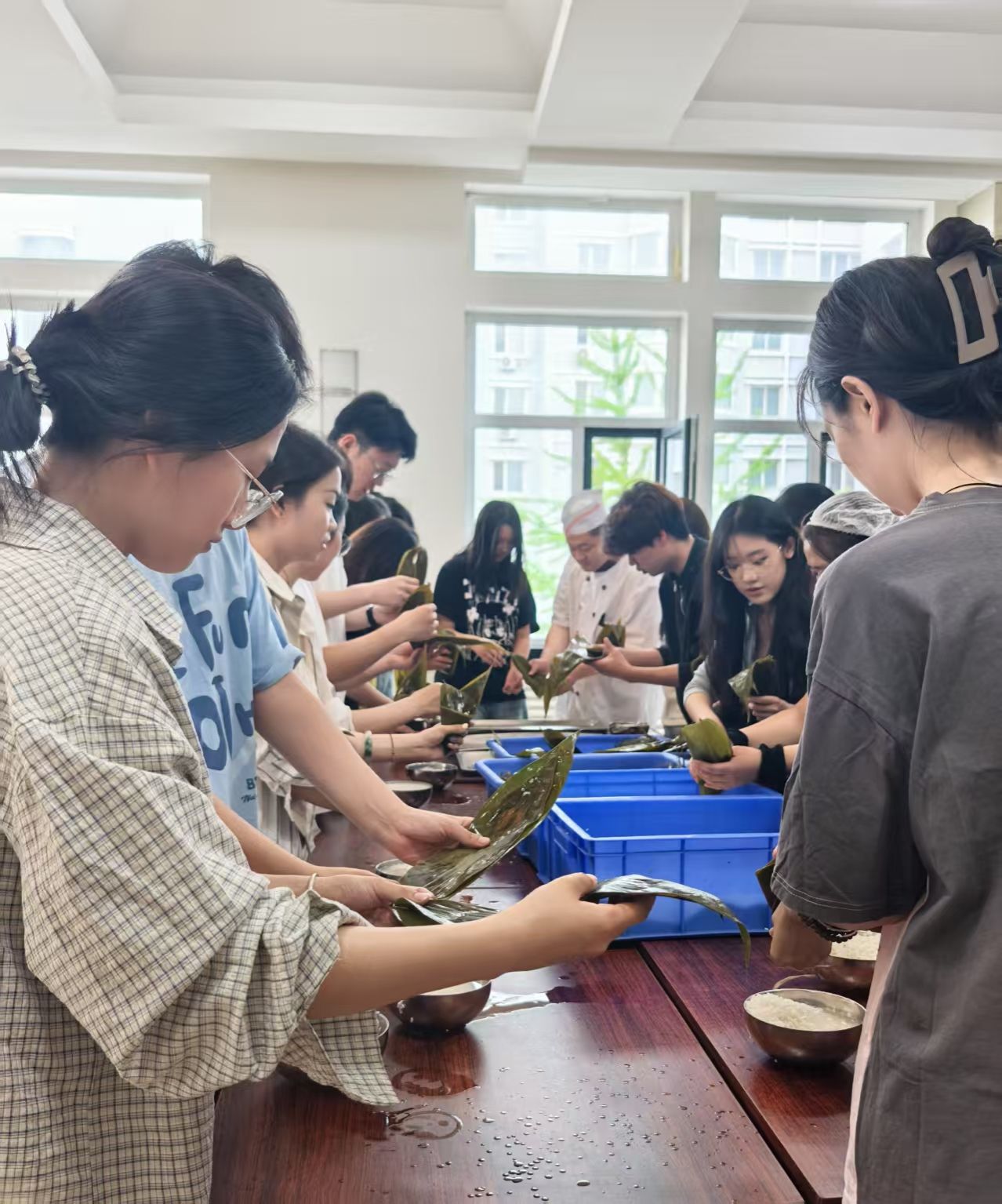 5月30日下午,艺术学院组织师生走进学生城食堂,举办“粽情端午 匠心传承”包粽子迎端午活动。艺术学院党委副书记、副院长(兼)韩营颖、班导师代表、学生工作干部及学生代表等20余人参加。