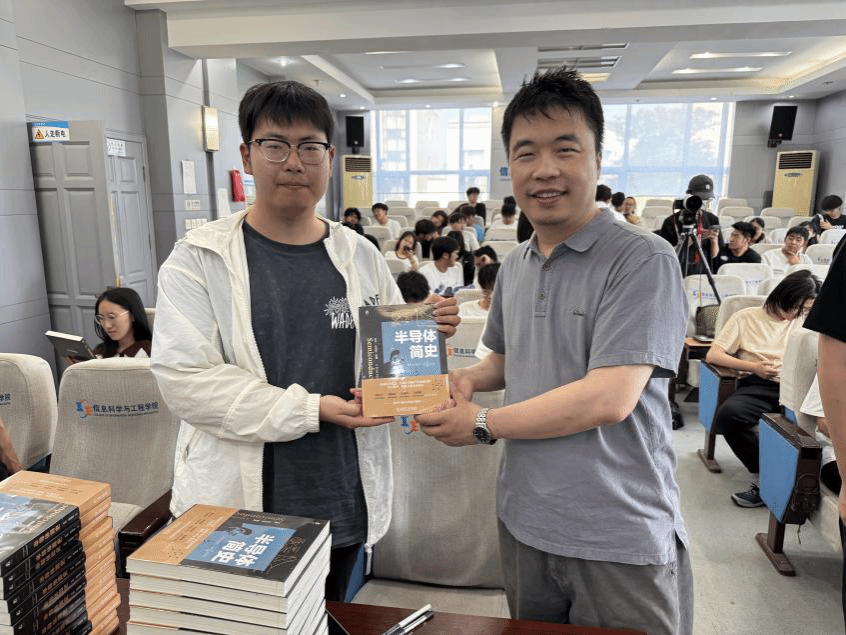 张继良围绕“什么样的人被这个社会需要?”“电子科学与技术专业是干啥的?”“大学期间干点啥?”三个主题进行了系统阐述。张继良结合自身求学、从教及科研等经历,分享了价值观、“技能点”“放大器”等十四条建议,引导同学们树立远大理想,锤炼过硬本领,不断拓展学习的领域。针对当前电子科学与技术专业发展新趋势,张继良向在场同学们赠阅了《半导体简史》,鼓励同学们好好学习、早规划、早准备,积极探索个人优势,合理配置学习与实践资源,明确发展方向。