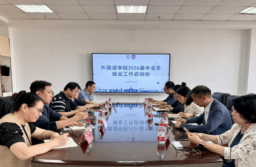 9月30日,外国语学院在主楼1004室召开就业工作领导小组会议暨2026届毕业生就业工作启动会。学生指导服务中心副主任程宏,外国语学院院长张威,党委书记张满胜,党委副书记、副院长(兼)严志刚,副院长李欣、李宗鹏,各系主任及全体学生工作干部参加会议。