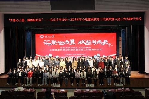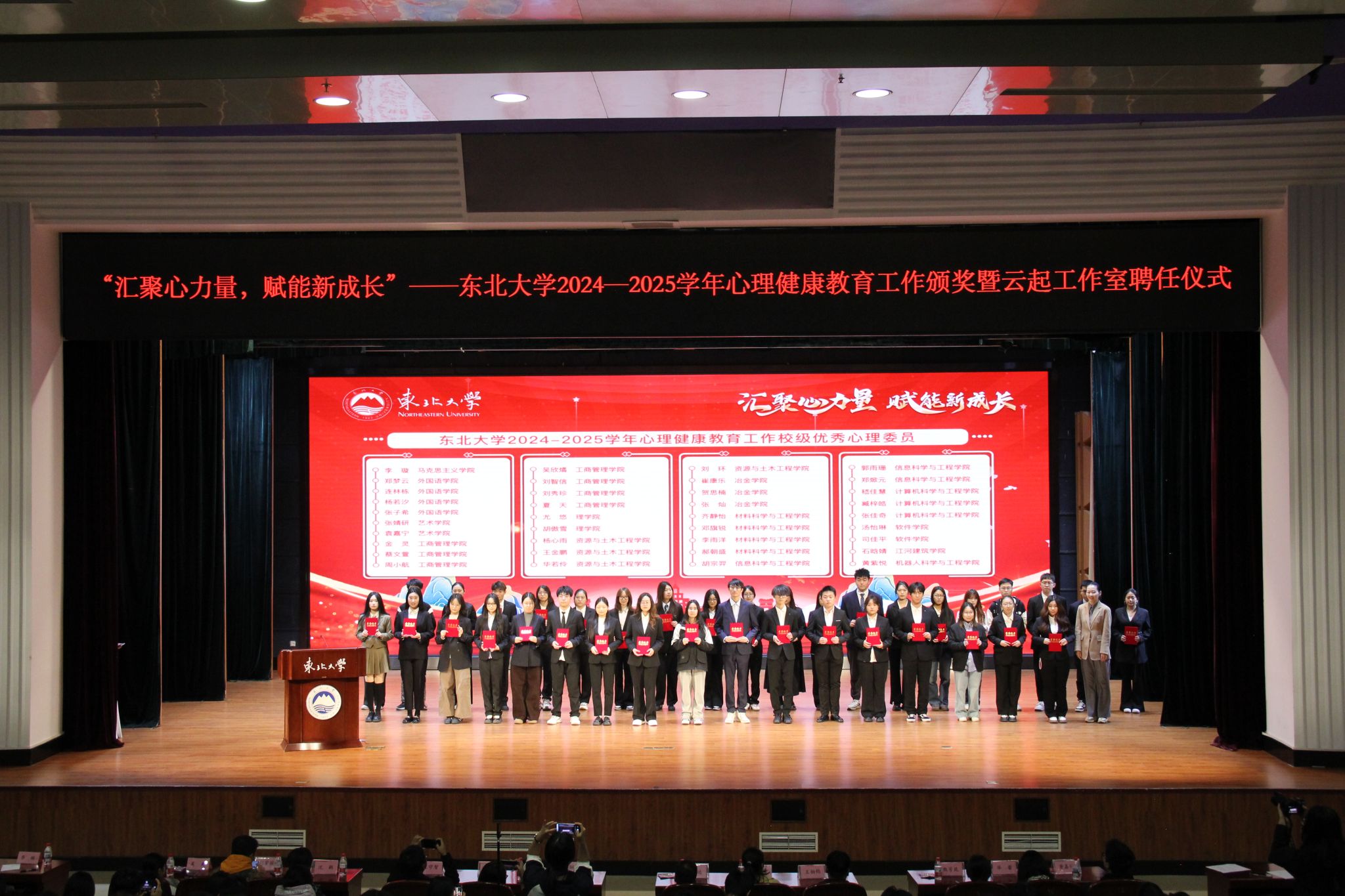 10月19日下午,“汇聚心能量,赋能新成长”东北大学2024—2025学年心理健康教育工作颁奖暨云起工作室聘任仪式在汉卿会堂蔡冠深报告厅举行。学生指导服务中心相关负责人、心理健康教育中心有关教师、各学院心理辅导员、2025级新生心理委员等400余人参加活动。