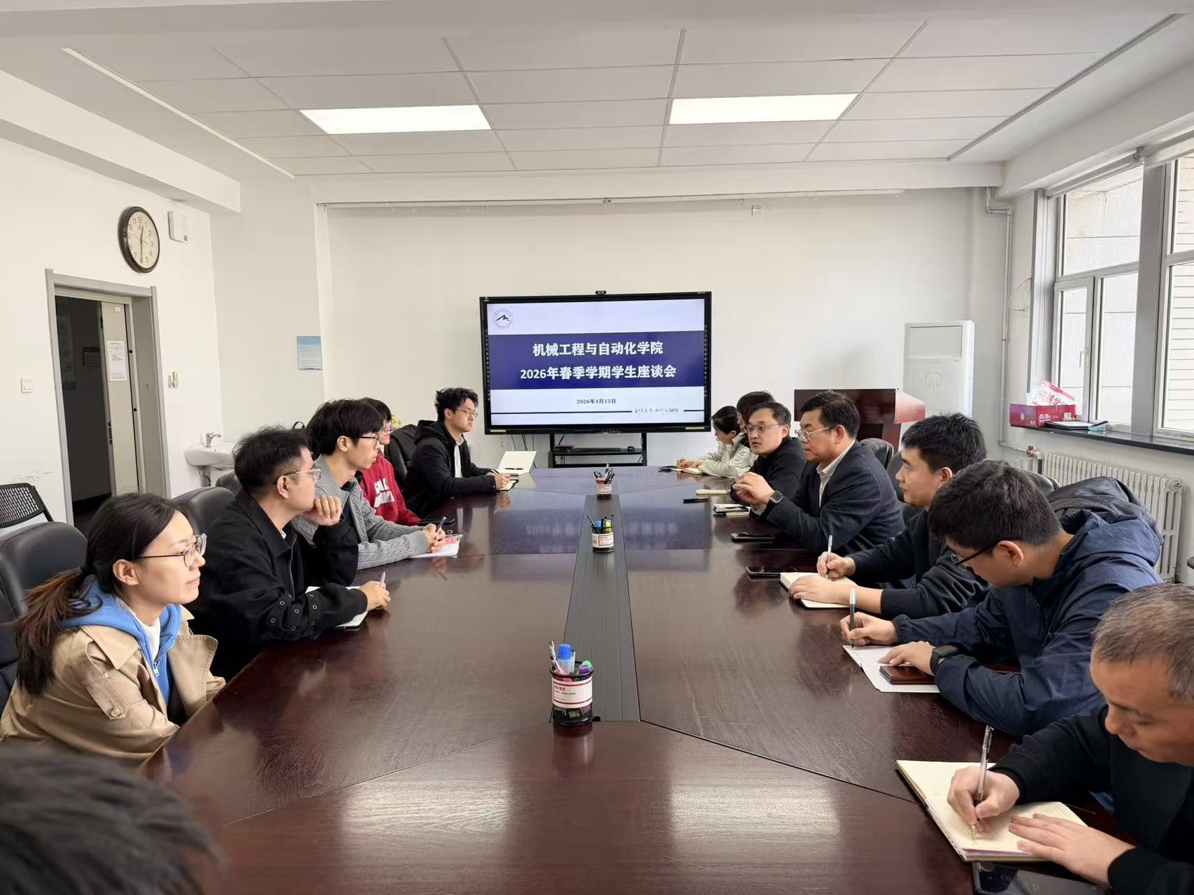 4月13日,机械学院在机械楼206室召开2026年春季学期学生座谈会。学院党委书记郝建山,党委副书记、副院长(兼)孙坤,副院长黄贤振,各系所负责人,学生工作相关老师出席会议,本硕学生代表参加座谈。