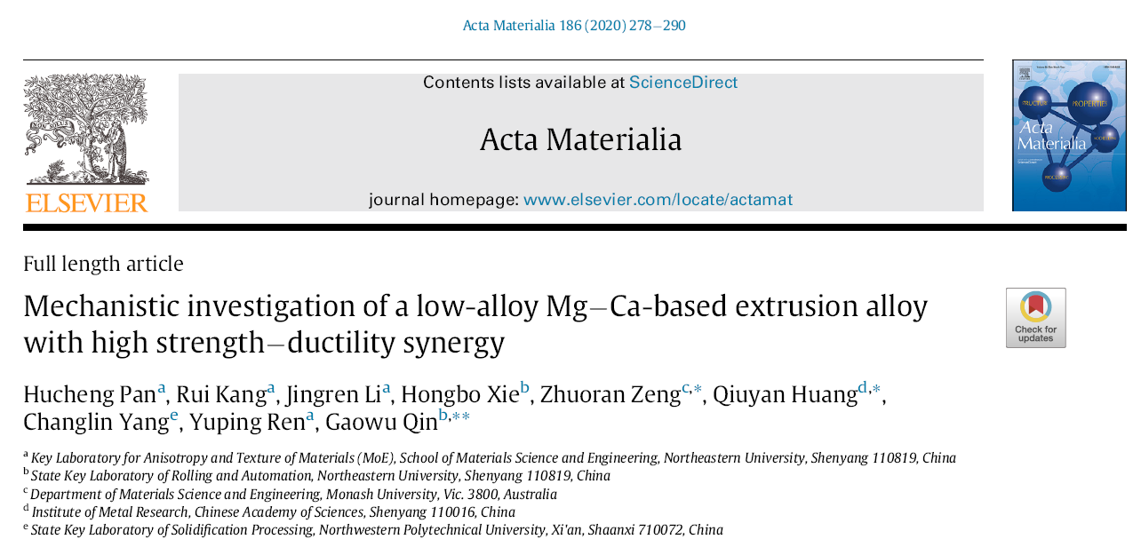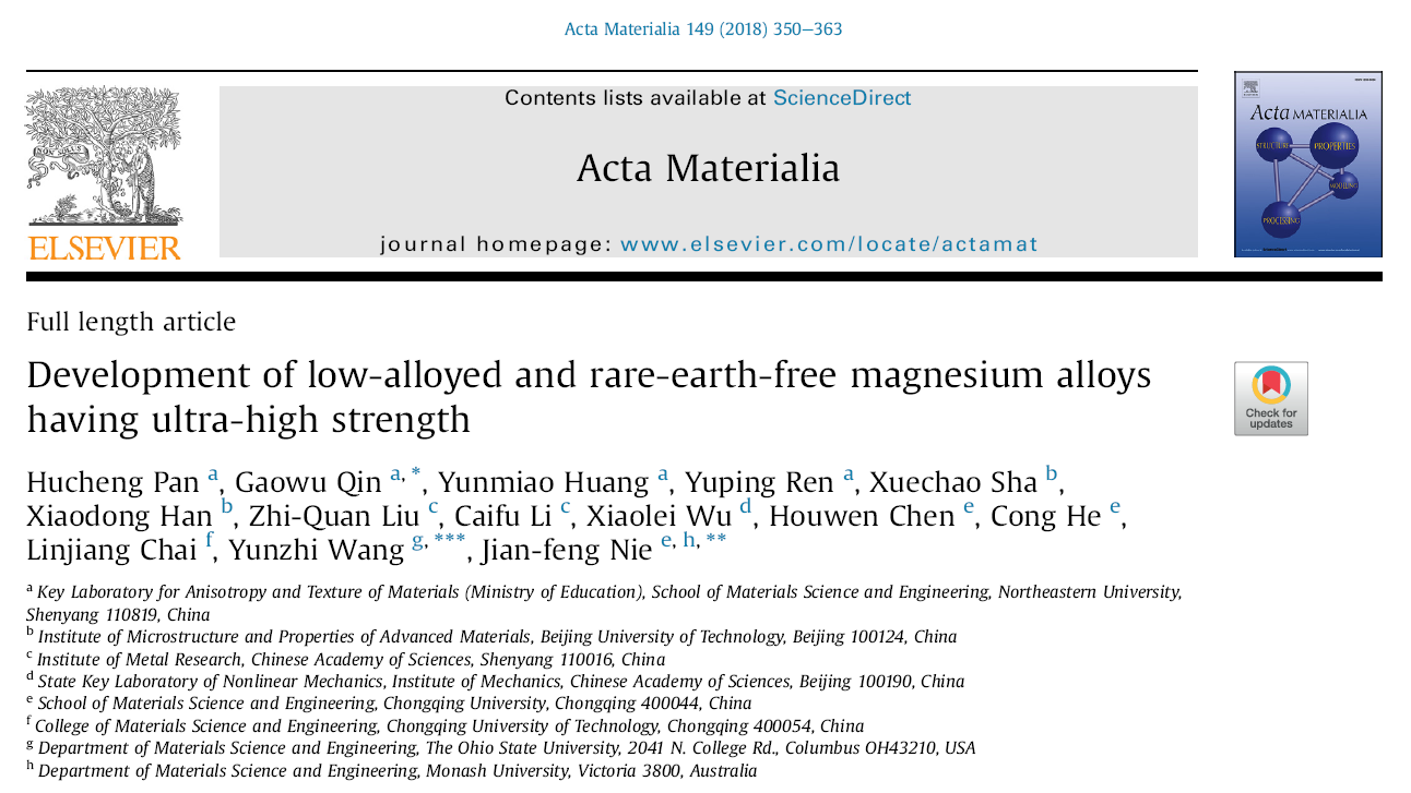 Recently, the team of Professor Qin Gaowu, School of Materials, Northeastern University, has made important progress in the research of low-cost magnesium alloy with high strength-ductility synergy. The "high strength and low-alloyed magnesium alloy" developed by the team has reached the highest strength in the world among the same kind of low-cost magnesium alloy, and successfully solved the bottleneck of mutual exclusion of strength and ductility of magnesium alloy, providing a new development path for the design of new high-performance deformed magnesium alloy materials. Relevant high-level research results have been published continuously in Acta Materialia, a top international journal of metal materials research, and have gained wide attention from researchers and industry both at home and abroad.