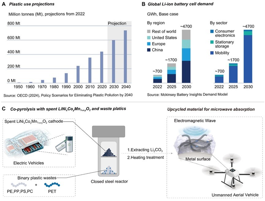 Figure A. Global plastic usage and projections Figure B. Global demand for lithium-ion batteries and projections Figure C. Synergistic pyrolysis process of retired lithium-ion batteries and binary plastics and their high-value upcycling into microwave absorbing materials