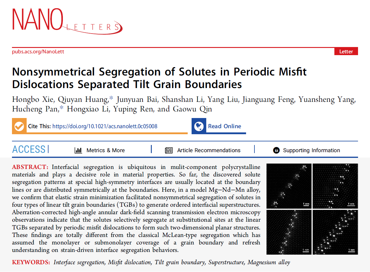 Recently, a research paper,Nonsymmetrical Segregation of Solutes in Periodic Misfit Dislocations Separated Tilt Grain Boundaries by professor Qin Gaowu’s team from the School of Material Science and Engineering of NEU and researcher Yang Yuansheng from the Institute of Metal Research of CAS has been published online in Nano Letters. In this study, the HAADF-STEM technique for spherical errors correction combined with molecular dynamics simulation is used to reveal the ordered segregation behavior of solute atoms at grain boundaries.