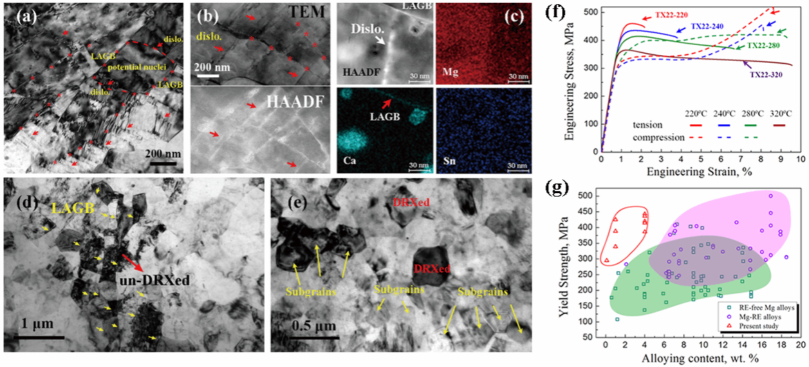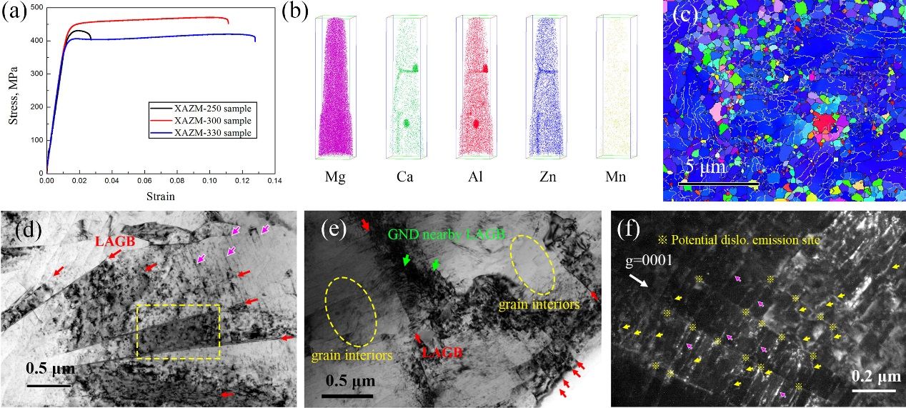 In recent years, based on phase equilibrium and thermodynamic calculation of magnesium alloy, the research team has discovered a new mechanism of grain refinement for the dynamic segregation of Ca solute induced by defects, and has successfully designed and prepared a series of Mg-Ca base alloys with excellent mechanical properties. In 2015, the tensile strength of Mg-Ca binary alloys can reach 330 MPa, which is ~ 100 MPa higher than that of Mg-Ca deformed alloys reported by Kim group of Korea, and the elongation can reach ~10% (J. Alloys Compd., 2015, 630:272-276). In 2017, Mg-Ca binary alloy was prepared based on traditional one-step extrusion. The grain size of the matrix can be further refined to ~0.7 μm, and the tensile strength at room temperature can reach ~400 MPa (Mater. Lett., 2019, 237:65-68). In 2018, the team found that adding a small amount of Ca to the conventional extruded Mg-2Ca-2Sn rare-earth-free alloy could induce the segregation of Ca at the grain boundary/subgrain boundary and the dynamic precipitation of nano-Mg2Ca. By giving full play to the alloying elements and the fine crystallization of the extrusion process, the α-Mg matrix was refined to a submicron size (~0.32μm) which is difficult to achieve by conventional extrusion. Thus, excellent mechanical properties (yield strength ~443 MPa) were demonstrated (Fig. 1). The alloy can obtain ultra-high strength at a solute content of~4wt.%, that is to say, "high-strength and low-alloyed magnesium alloy" was achieved (Acta Materialia, 2018, 149:350-363).