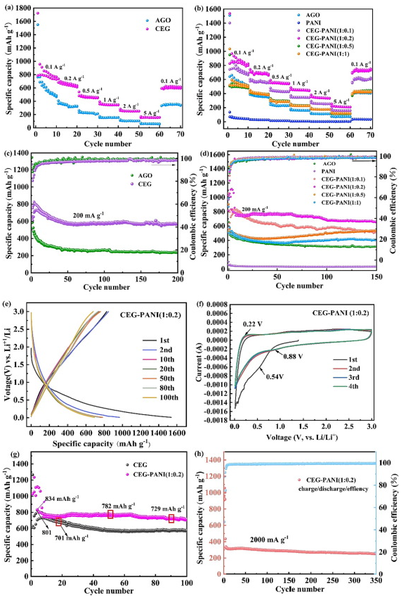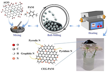 In order to prepare this advanced composite material, acidic graphene oxide (AGO) and PANI were first ball milled, followed by low-temperature chemical expansion to form chemically expanded graphene (CEG), forming a mesoporous nanonet with a lattice layer spacing of 0.362 nm, and embedding PANI nanoparticles. The performance of CEG-PANI nanocomposites is superior to CEG, with a specific reversible capacity of 664mAh g-1 after 150 cycles at 200mA-g-1 and a discharge capacity of 253 mAh g-1 after 350 cycles at 2000mA-g-1. The improvement in electrochemical performance of CEG-PANI is attributed to its large specific surface area, mesostructure, and conductive homogeneous graphene nanonetwork doped with N heteroatoms of polyaniline, which provide sufficient active sites for rapid storage of lithium ions. Nanostructured CEG-PANI is an ideal candidate material for lithium-ion battery anodes.