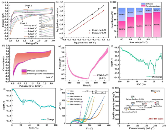 Figure 7. (a) CV curves of CEG-PANI (1:0.2) at different scanning rates.(b) B values under different peak currents after linear fitting.(c) The contribution ratio of pseudo capacitance and diffusion capacity under different scanning rates.(d) The CV curve of the composite material and the calculated false capacitance contribution rate in the shaded area at a scanning rate of 1.0 mV-s-1.(e) The GITT curve and Li+diffusion coefficient of CEG-PANI (1:0.2) anode during (f) petrification and (g) decalcification processes.(h) Nyquist diagram of electrode materials for AGO, PANI, CEG-PANI (1:0.1,1:0.2,1:0.5,1:1).