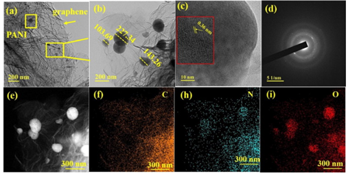Figure 3. (a, b) TEM morphological characteristics of CEG-PANI (1:0.2). (c) High resolution transmission electron microscopy micrographs show that the crystal plane with a interlayer spacing of 0.36 corresponds to the (002) plane of lonsdaleite. (d) The diffraction pattern recorded on the graphene sheet, where the bright ring corresponds to the (002) crystal plane of graphene in CEG-PANI (1:0.2). (e-i) Display the corresponding element diagram images of materials with distributions of (f) C, (h) N, and (i) O.