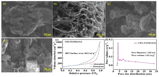 Figure 2. SEM micrographs of (a) CEG-PANI (1:0.1), (b) CEG-PANI (1:0.2), (c) CEG-PANI (1:0.5) and (d) CEG-PANI (1:1); (e) Adsorption/desorption isotherms of N2CEG-PANI (1:0.2). (f) Pore size distribution of CEG-PANI (1:0.2).