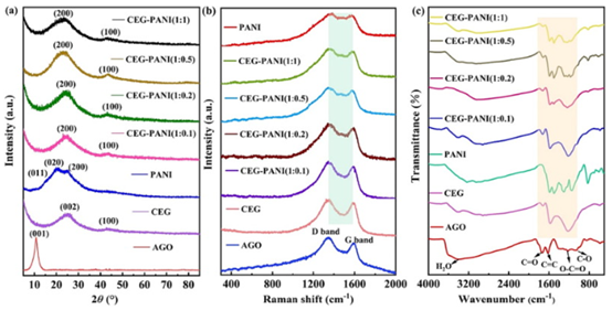 Figure 4. XRD spectra of (a) AGO, PANI, CEG, CEG-PANI (1:0.1), CEG-PANI (1:0.1), CEG-PANI (1:0.5), and CEG-PANI (1:1) powders. (b) Raman spectra of AGO, PANI, CEG, CEG-PANI (1:0.1), CEG-PANI (1:0.2), CEG-PANI (1:0.5), and CEG-PANI (1:1) powders; (c) Fourier transform infrared spectroscopy.
