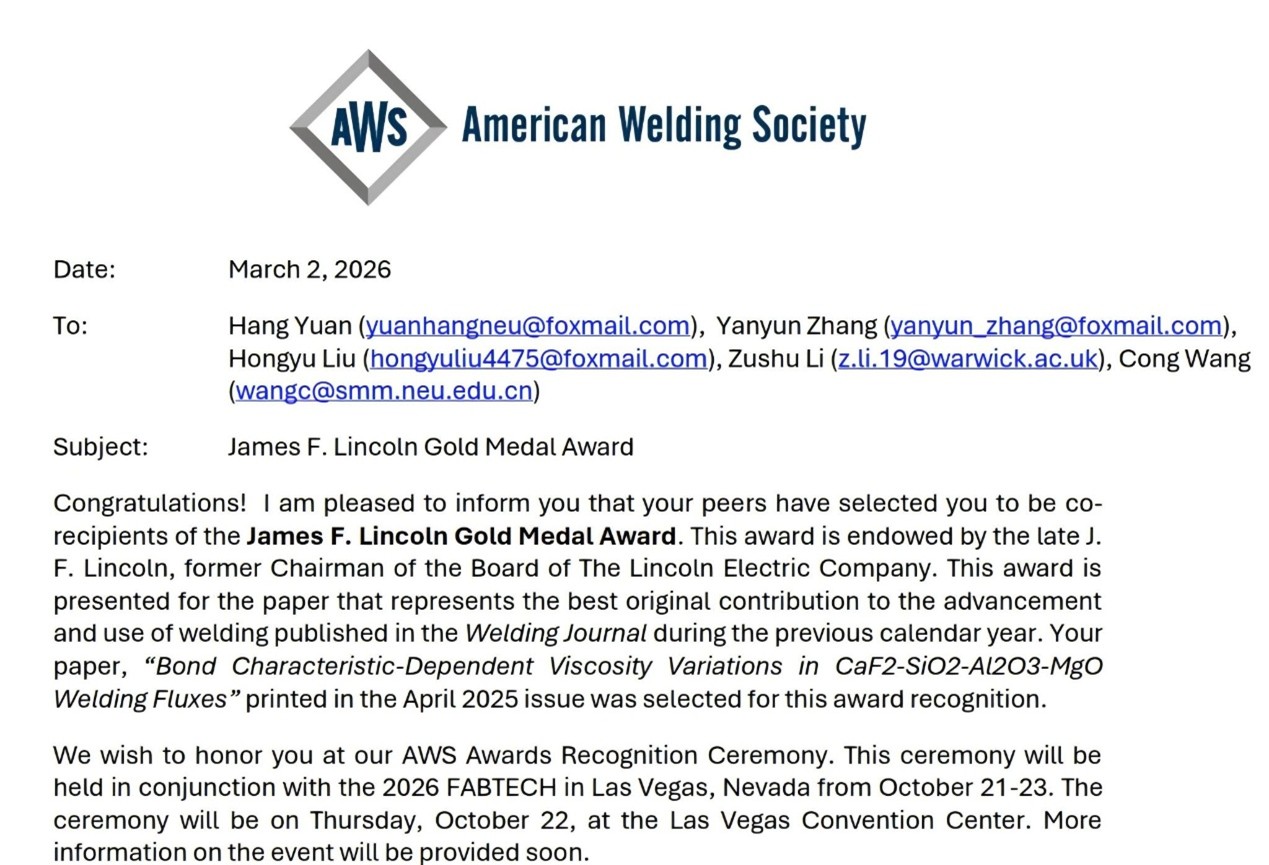 Recently, Professor Wang Cong's research team from the School of Metallurgy at NEU received official notification from the American Welding Society (AWS) that their research findings have been selected for the 2026 James F. Lincoln Gold Medal Award. This marks the first time since the award's establishment in 1936 that a research team from the Chinese mainland has been honored as the first completion unit.