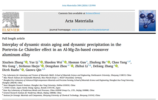 A research team led by Professors Zhou Dengshan, Zhang Deliang, and Qin Gaowu from the School of Materials Science and Engineering at NEU has made significant progress in the study of non-steady-state plastic deformation in Al-Mg-Zn-based cross aluminum alloys. Their findings were published in the prestigious materials science journal Acta Materialia under the title: “Interplay of dynamic strain aging and dynamic precipitation in the Portevin-Le Chatelier effect in an Al-Mg-Zn-based cross aluminum alloy.” The paper’s first author is PhD candidate Zhang Xiuzhen, and Professor Zhou Dengshan serves as the corresponding author. Co-authors include Dr. Li Yue, Dr. Wei Shaolou, and Professor Dierk Raabe from the Max Planck Institute for Sustainable Materials, Germany, Assistant Professor Yang Chao from Shanghai Jiao Tong University, and Dr. Gong Wu and Dr. Stefanus Harjo from the J-PARC center (Japan).