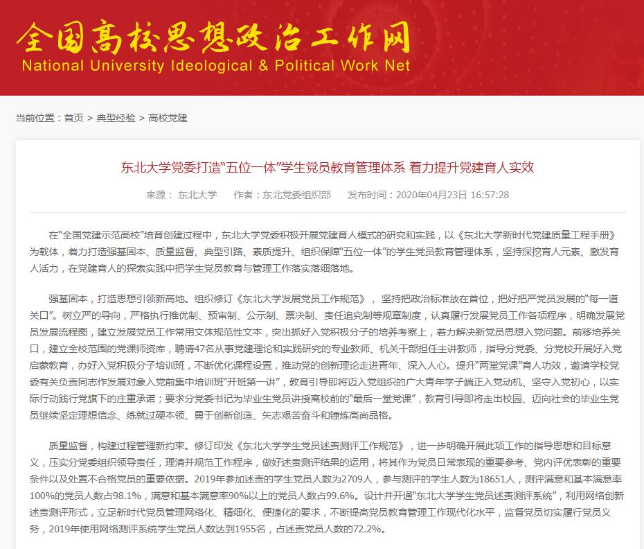 在“全国党建示范高校”培育创建过程中,东北大学党委积极开展党建育人模式的研究和实践,以《东北大学新时代党建质量工程手册》为载体,着力打造强基固本、质量监督、典型引路、素质提升、组织保障“五位一体”的学生党员教育管理体系,坚持深挖育人元素、激发育人活力,在党建育人的探索实践中把学生党员教育与管理工作落实落细落地。