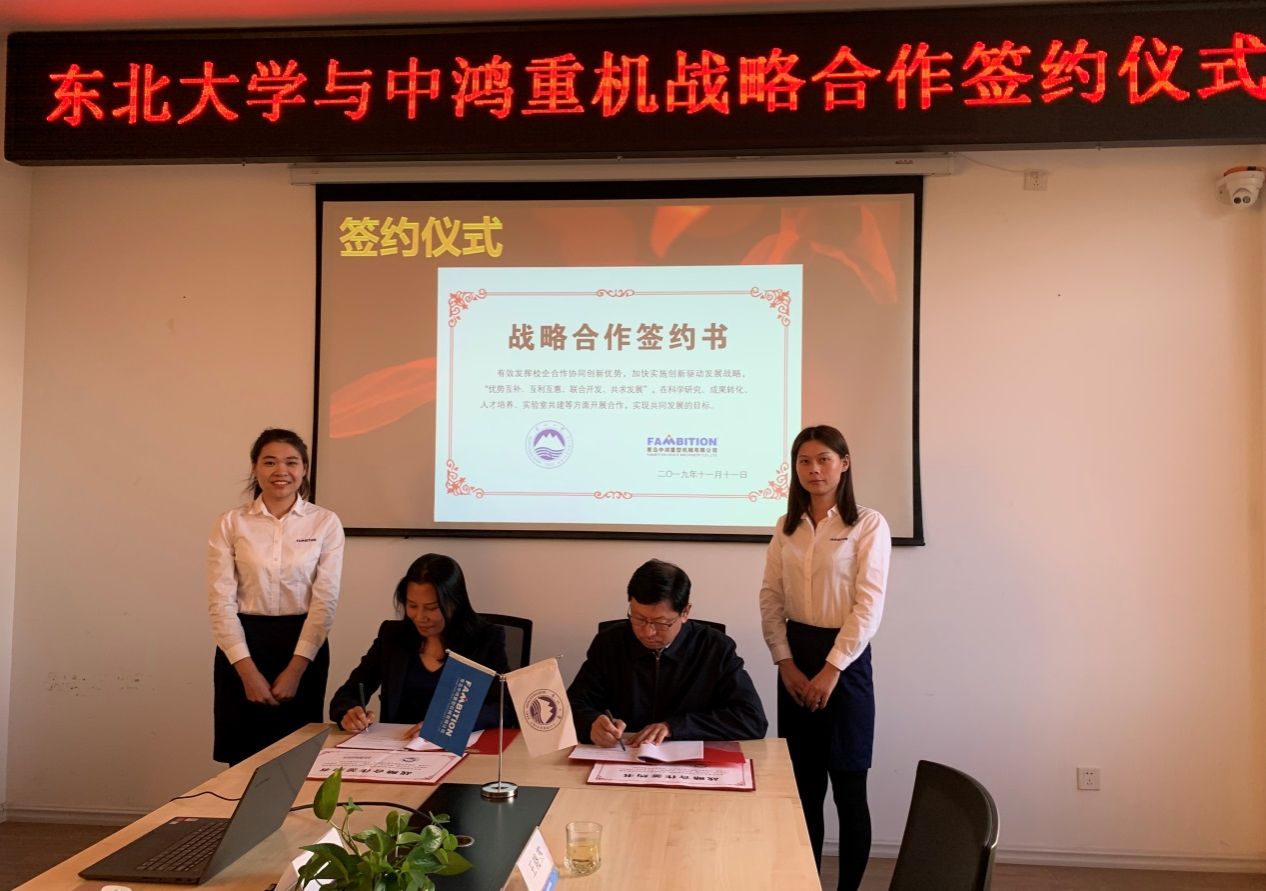 孙雷与中鸿重机总经理苏珊代表双方共同签署了东北大学与青岛中鸿重型机械有限公司全面战略合作协议。按照协议,东北大学与中鸿重机,本着“优势互补、互利互惠、联合开发、共求发展”的原则,在科学研究、成果转化、人才培养、实验室共建等方面开展合作。