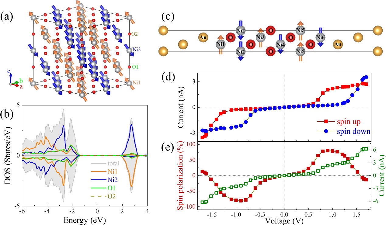 图1. (a) NiO的共线反铁磁结构,(b) NiO的态密度,(c)设计的器件示意图,(d)不同偏压下自旋向上和向下的电流,(e)总电流和自旋极化率的偏压关系。