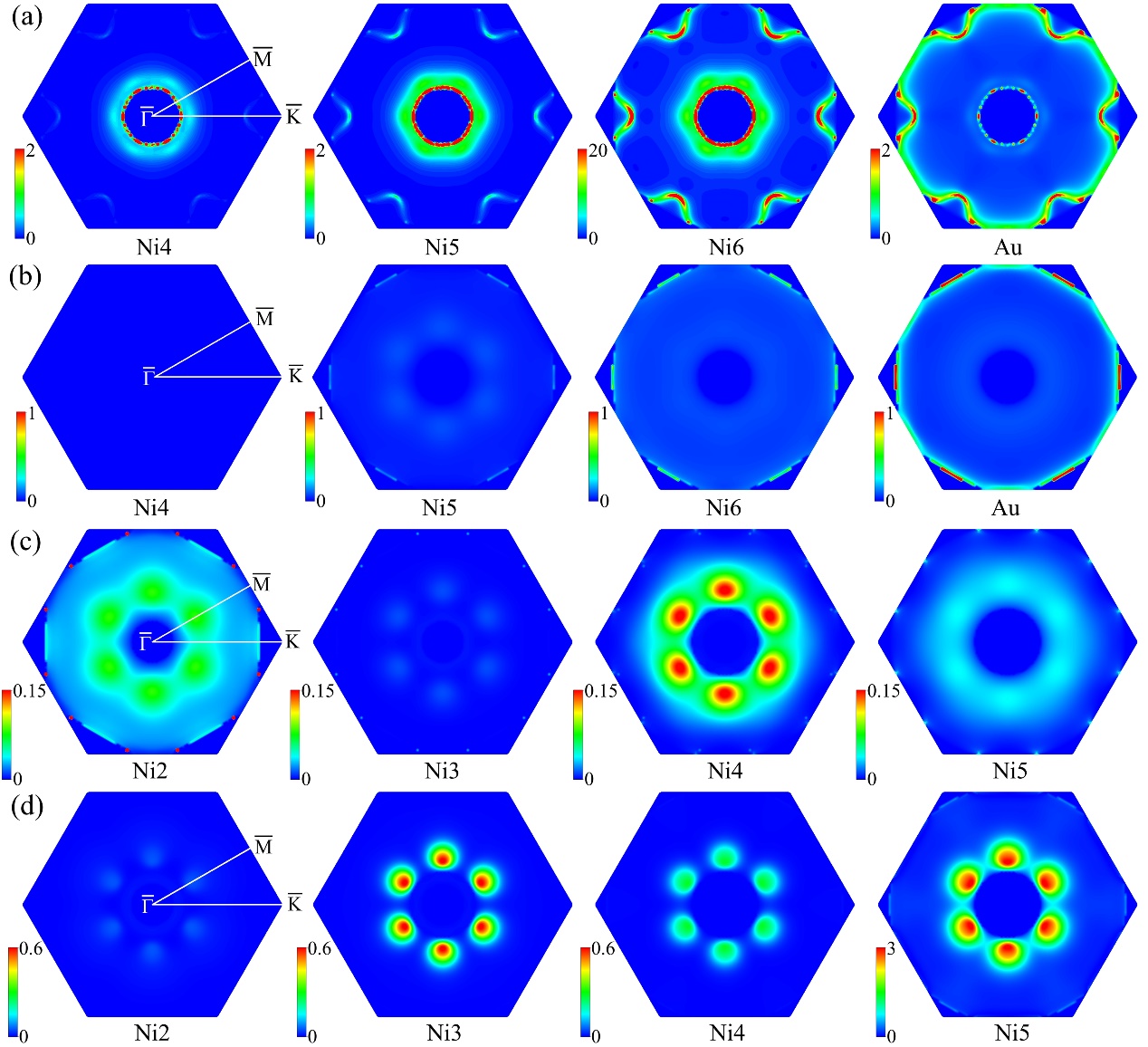 图3. k 分辨的自旋电子态密度。能量为0.26 eV的界面处自旋向上(a)和自旋向下(b);能量为0.8 eV的中间层自旋向上(c)和自旋向下(d)。
