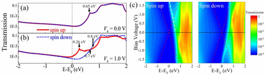 图2. 0 V(a)和1V(b)偏压下的自旋电子透射谱,不同能量和偏压下的自旋电子透射图(c)。