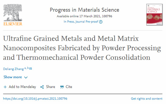 近日,东北大学材料科学与工程学院张德良教授以第一作者和通讯作者的身份,在国际材料领域顶级综述期刊《Progress in Materials Science》(期刊影响因子IF=31.56)上发表了长篇综述论文“Ultrafine Grained Metals and Metal Matrix Nanocomposites Fabricated by Powder Processing and Thermomechanical Powder Consolidation”。