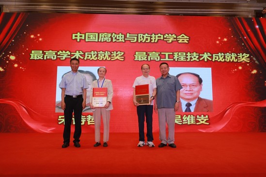 会议表彰了中国腐蚀与防护学会最高学术成就奖和最高工程技术成就奖。按照学会章程,经过严格遴选,天津大学宋诗哲教授因其在推动我国腐蚀电化学领域发展作出的突出贡献获得最高学术成就奖,中国科学院金属研究所吴维㞵研究员因其在激光仿形增材制造技术的发展与应用和航空航天高温防护技术方面作出的突出贡献,获得最高工程成就奖。名誉理事长陈光章研究员和理事长王福会教授为两位获奖者颁奖。