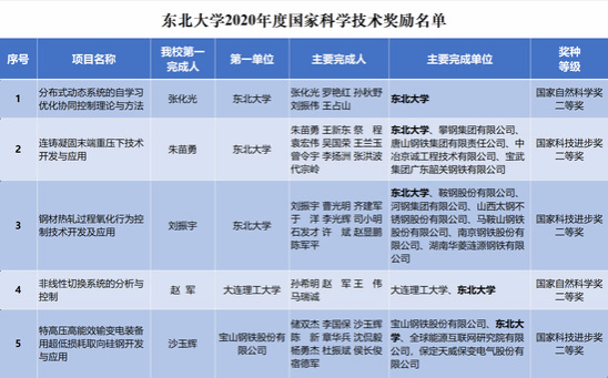 东北大学作为第一完成人和第一单位牵头完成的“分布式动态系统的自学习优化协同控制理论与方法”项目获得国家自然科学二等奖。东北大学主要完成人是张化光、罗艳红、孙秋野、刘振伟、王占山。