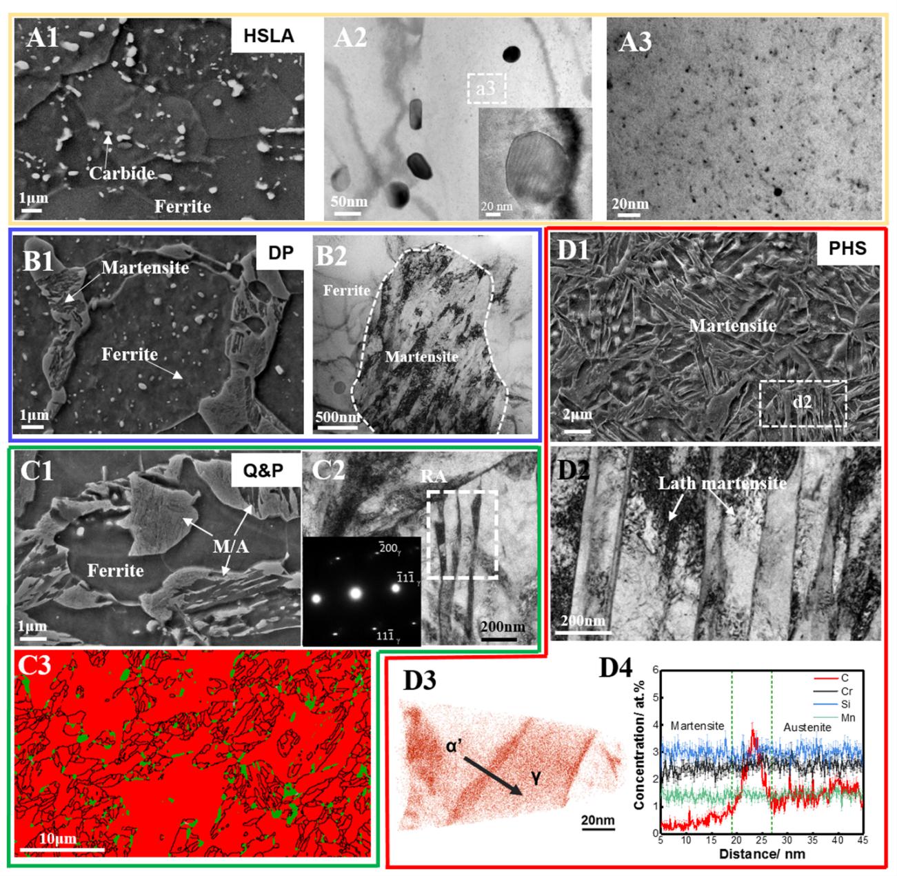 据悉,研究人员借鉴了若干目前主要先进高强钢的设计理念,选择低成本的碳 (C)、锰 (Mn)、硅 (Si) 和铬 (Cr) 作为主要合金元素,使用铌 (Nb) 作为微合金元素添加。通过成熟的热处理工艺,灵活组合了铁素体、马氏体、奥氏体和纳米碳化物等物相,从而得了Unisteel衍生的HSLA、DP、Q&P和PHS钢种对应的显微组织。