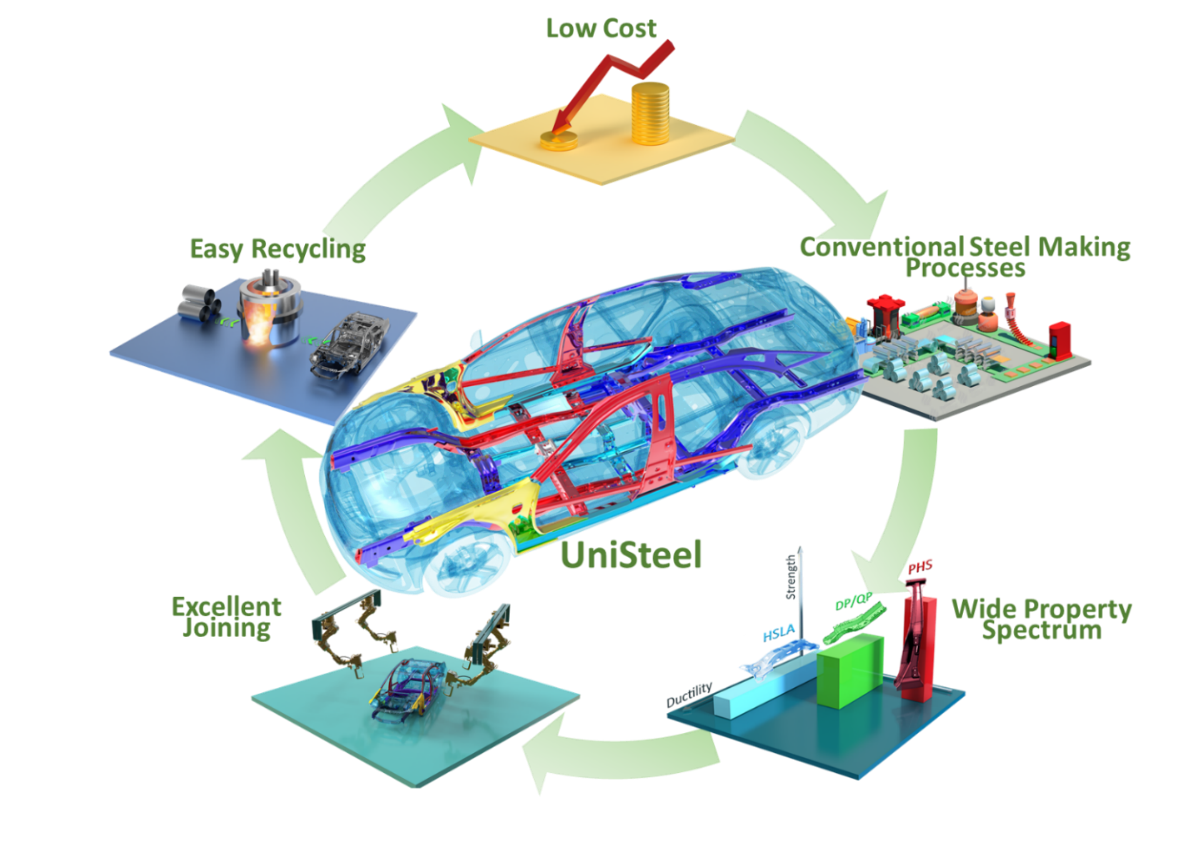 UniSteel概念体现了一种崭新的技术路径,巧妙的成分设计和传统物理冶金百年知识的累积,完美地实现了“成分”和“性能”之间的“1和N”映射关系。UniSteel可以灵活通过热处理获得性能优异的各种衍生钢种,解决了现今多钢种车身制造的大多数系统性的问题,有望革新全球汽车行业的车身制造模式,通过钢种的“素化”来降低钢质白车身设计、采购、生产和制造等各个环节的复杂性,在车身轻量化的同时大幅度降低车身用钢的碳排放,从而助力汽车行业早日实现碳中和。