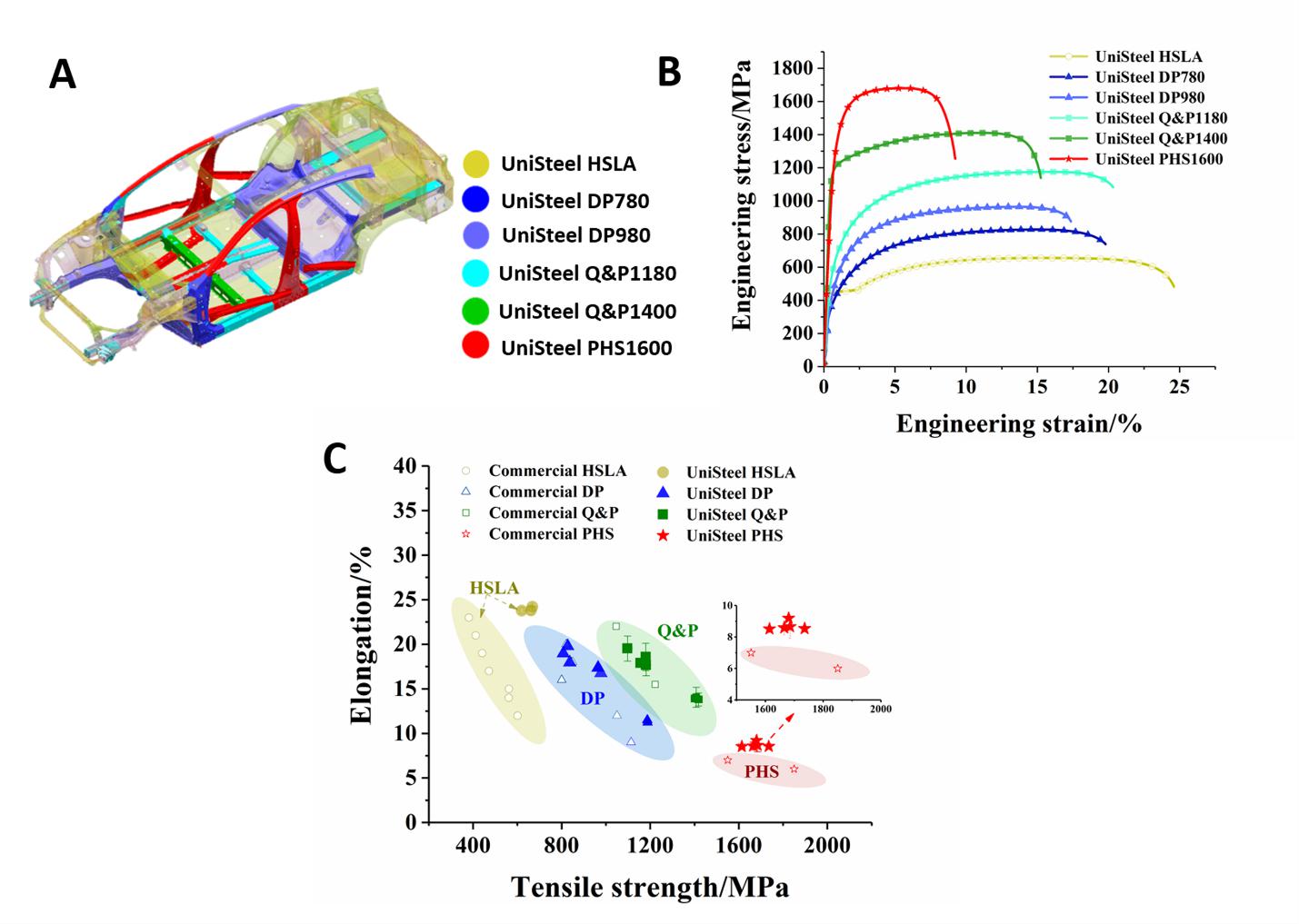 图:(a) 使用 UniSteel衍生的 HSLA、DP、Q&P 和 PHS 的白车身设计;(b) UniSteel衍生钢种的拉伸性能;(c) UniSteel衍生钢种和一些现有商业钢种的抗拉强度和延伸率的比较。