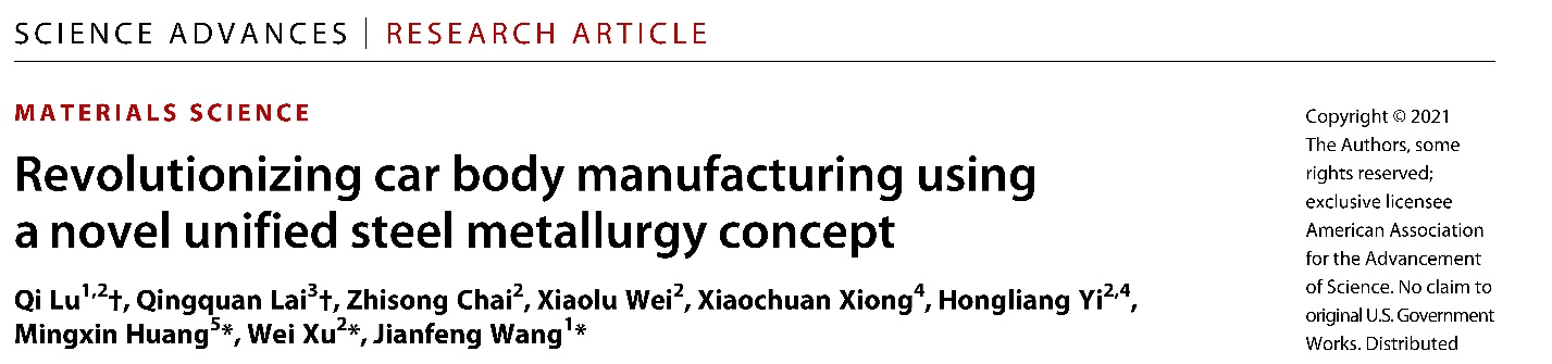 近日,东北大学轧制技术及连轧自动化国家重点实验室师生在国际著名期刊Science子刊Science Advances上发表题为《UniSteel—革命性的钢车身制造概念》的论文。论文第一作者为通用汽车中国科学研究院高级研究员、东北大学客座教授卢琦博士;南京理工大学赖庆全副教授为共同第一作者;通讯作者为通用汽车中国科学研究院院长王建锋,东北大学轧制技术及连轧自动化国家重点实验室教授徐伟,轧制技术及连轧自动化国家重点实验室特聘教授、香港大学黄明欣教授。论文的作者还包括育材堂(苏州)材料科技有限公司熊小川博士和轧制技术及连轧自动化国家重点实验室易红亮教授,以及徐伟教授课题组的两位东北大学博士研究生柴志松和魏晓蓼。该论文提出了以单一钢铁合金成分取代已有繁多的汽车钢种成分,即UniSteel概念。
