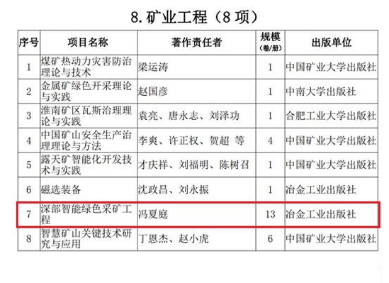 12月28日,国家新闻出版署《出版业“十四五”时期发展规划》公布了“十四五”时期国家重点图书出版专项规划,由东北大学校长、中国工程院院士冯夏庭教授主持的《深部智能绿色采矿工程》项目入选“十四五”时期国家重点图书出版专项规划。
