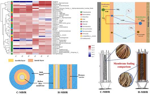 该研究将同步短程硝化反硝化工艺与膜曝气技术相耦合,设计开发了复合式膜曝气生物膜反应系统(H-MBfR),用于解决我国污水碳氮比不足导致的处理成本增高问题。新型系统在高效处理水体污染物的同时,提升了膜组件的抗污染能力,从而延长系统使用寿命,并降低了污水处理的运行能耗,为污水脱氮处理提供了新的思路,有利于环保领域碳减排的实现。