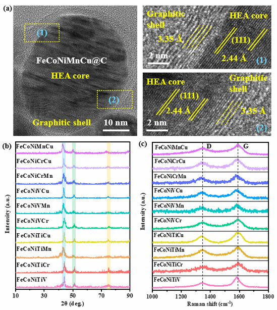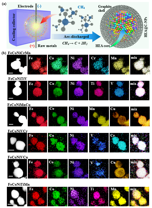 HEA@C纳米胶囊材料通过直流电弧等离子放电设备进行制备。在制备过程中,金属原料与甲烷气体在电弧处分解,产生金属和碳蒸气,上述混合气体由于设备内的高温度梯度向冷却壁移动并在冷却壁上发生非平衡冷却,形成粒径尺寸在25 nm左右的核@壳纳米胶囊材料。通过XRD表征发现,材料内部高熵合金主要为FCC结构。Raman光谱测试则显示材料具有较为接近的石墨壳层结构。