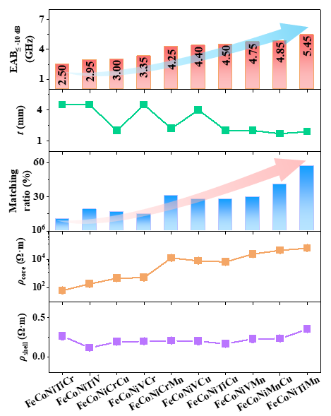 受到课题组近期发表在Angew. Chem. Int. Ed. 2021, 60, 27113的纳米高熵合金颗粒所启发,在反应气氛中原位分解甲烷气氛,一步法直接获得碳包覆高熵合金颗粒。其研究结果表明,材料的微波吸收性能与核层高熵合金材料的电阻率具有显著关联。伴随材料内部高熵合金元素的变化,纳米胶囊的有效吸收带宽(EAB(≤-10 dB))和阻抗匹配特性伴随其电阻率的升高出现明显提升。其中,在FeCoNiTiMn@C纳米胶囊中,材料的有效吸收带宽达到了5.45 GHz(12.55-18.00 GHz),同时其吸收体厚度为1.9 mm,展现出了良好的微波吸收性能。