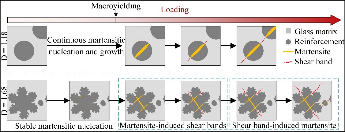该研究不仅拓展了对TRIP强化非晶复合材料中分形结构的基础认知,深化了对其变形机制的理解,同时为高性能复合材料的设计提供了新的理论支撑。上述研究得到国家重点研发计划和国家自然科学基金项目的支持。