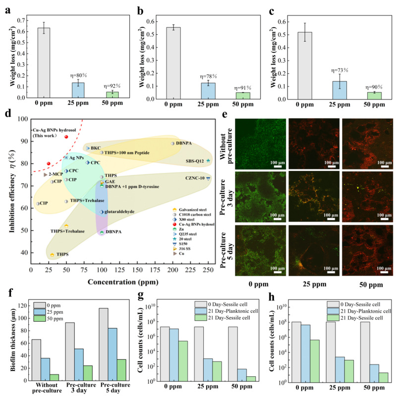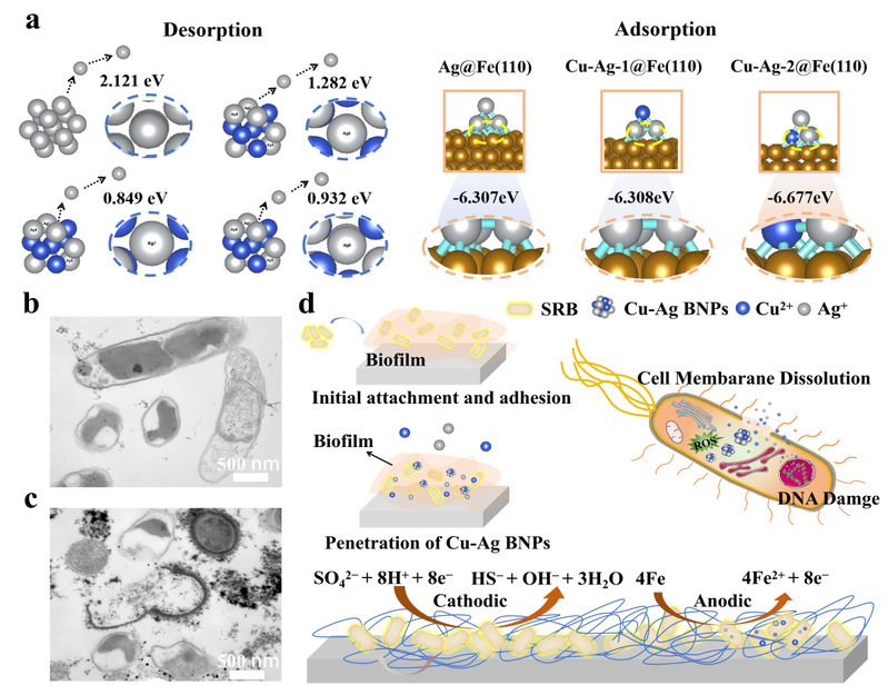 近年来,纳米金属颗粒作为一种新型杀菌剂,因其高效和广谱等优点已逐渐成为微生物腐蚀防治领域的研究热点。研究表明,纳米金属颗粒能够渗透进入细菌细胞内部,破坏细胞膜和DNA等,从而高效杀灭细菌。但是,纳米颗粒由于粒径小,比表面积大,易产生团聚,大大降低了其杀菌功效。因此,纳米颗粒的稳定性是获得最佳杀菌效率和工程化应用的重要前提。针对这一挑战,研究团队利用化学还原法合成了一种高分散性和优良水溶性的Cu-Ag双金属纳米颗粒(BNPs)水溶胶杀菌剂。该杀菌剂不仅具有高效的杀菌性能,而且能够有效抑制微生物腐蚀,完美突破了杀菌和缓蚀无法高效兼容的限制,为传统的防腐蚀策略提供了一个创新的双功能解决方案。