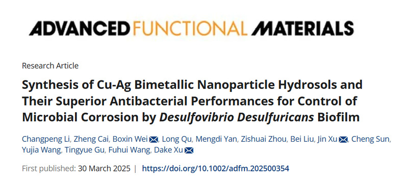 近日,东北大学材料科学与工程学院王福会教授团队徐大可教授课题组和中国科学院金属研究所许进研究员团队在Advanced Functional Materials上发表了题为“Synthesis of Cu-Ag Bimetallic Nanoparticle Hydrosols and Their Superior Antibacterial Performances for Control of Microbial Corrosion by Desulfovibrio desulfuricans Biofilm”的研究论文。东北大学材料科学与工程学院硕士生李昌鹏和中国科学院金属研究所博士生才政为共同第一作者,通讯作者为徐大可教授、许进研究员和韦博鑫副研究员。