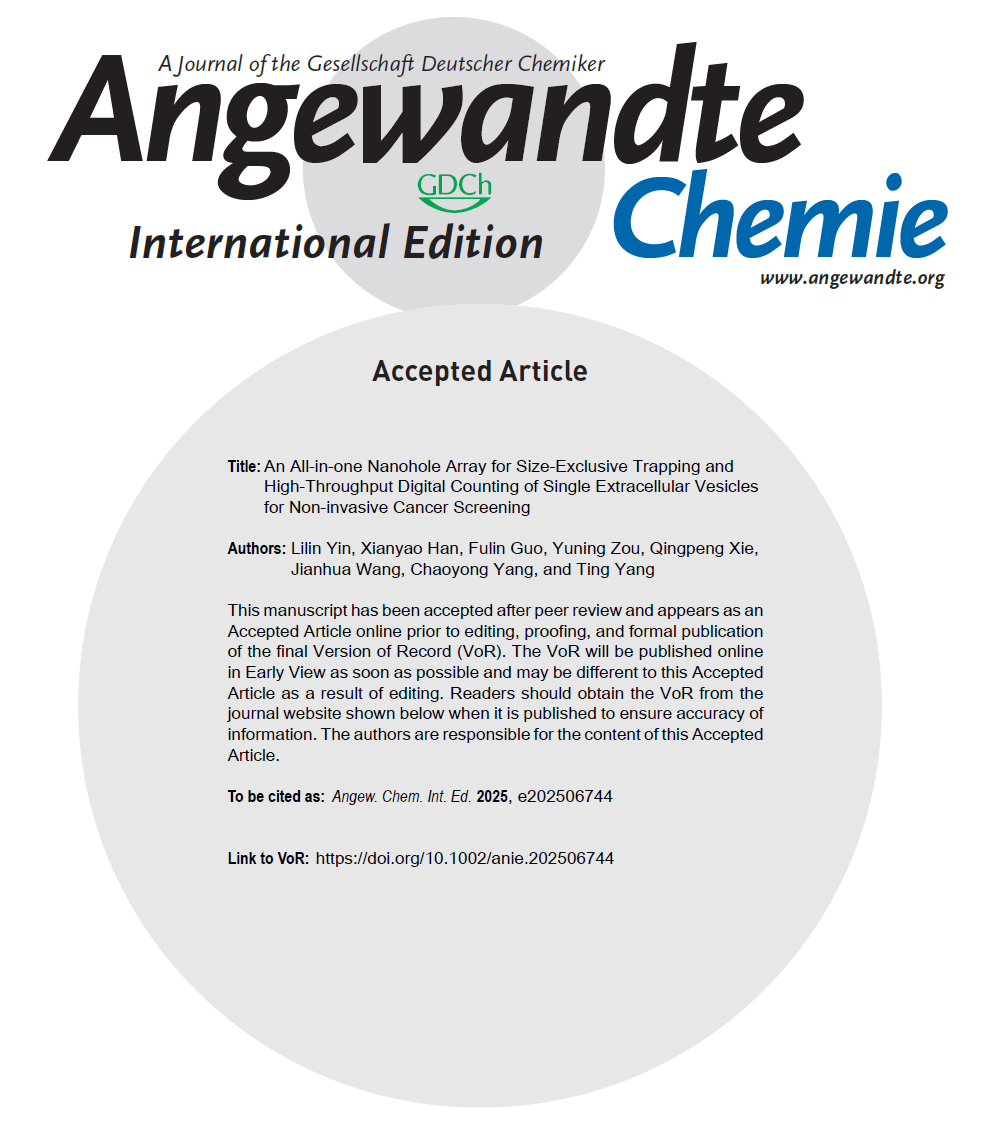 5月11日,东北大学理学院化学系杨婷教授课题组在化学学科国际顶级期刊Angewandte Chemie杂志在线发表题为“An All-in-one Nanohole Array for Size-Exclusive Trapping and High-Throughput Digital Counting of Single Extracellular Vesicles for Non-invasive Cancer Screening”的研究论文。东北大学为该论文的第一完成单位,理学院化学系博士生尹理琳与信息学院博士生韩先尧为共同第一作者,杨婷教授与厦门大学杨朝勇教授、辽宁省肿瘤医院谢庆鹏为共同通讯作者。